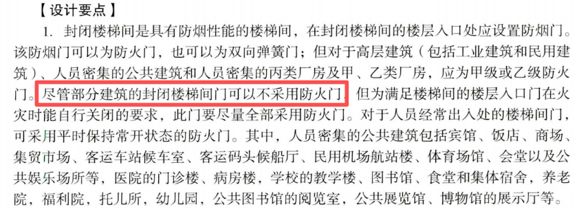 而針對(duì)封閉樓梯間,沿用建規(guī)的,除了甲、乙類廠房,多層丙類廠房,人員密集的公共建筑和其他高層工業(yè)與民用建筑中封閉樓梯間的門,并沒有強(qiáng)調(diào)要求使用防火門。